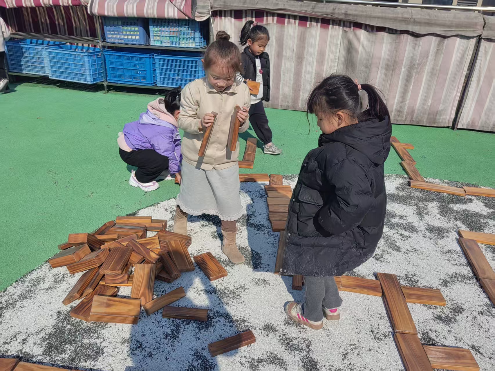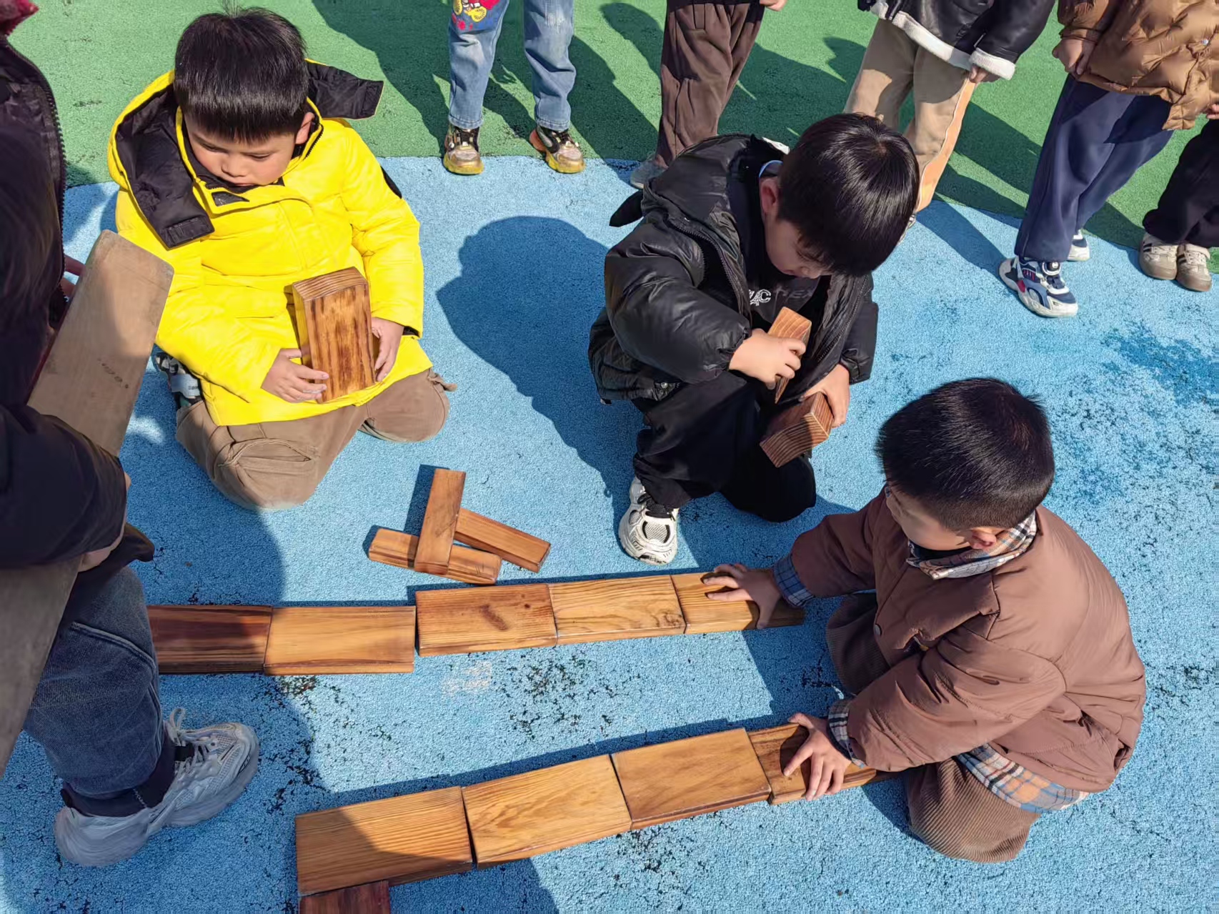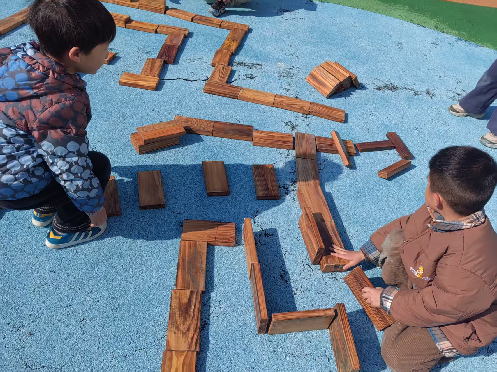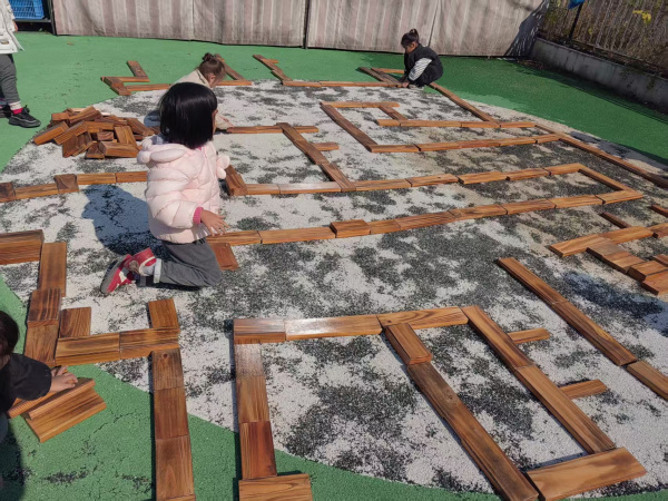 小朋友们自己选择不同形状的木质材料进行设计,迷宫里首先做好出口,然后前后左右不同方向的弯道,大家还做了障碍。障碍需要跳过去,还布置了许多的死路,出口布置了好几个,太多了,又进行了改进;男生女生设计了两个路线,大家在走迷宫的时候看看哪里设计的不合理并及时调整,可以大家互相参观学习。