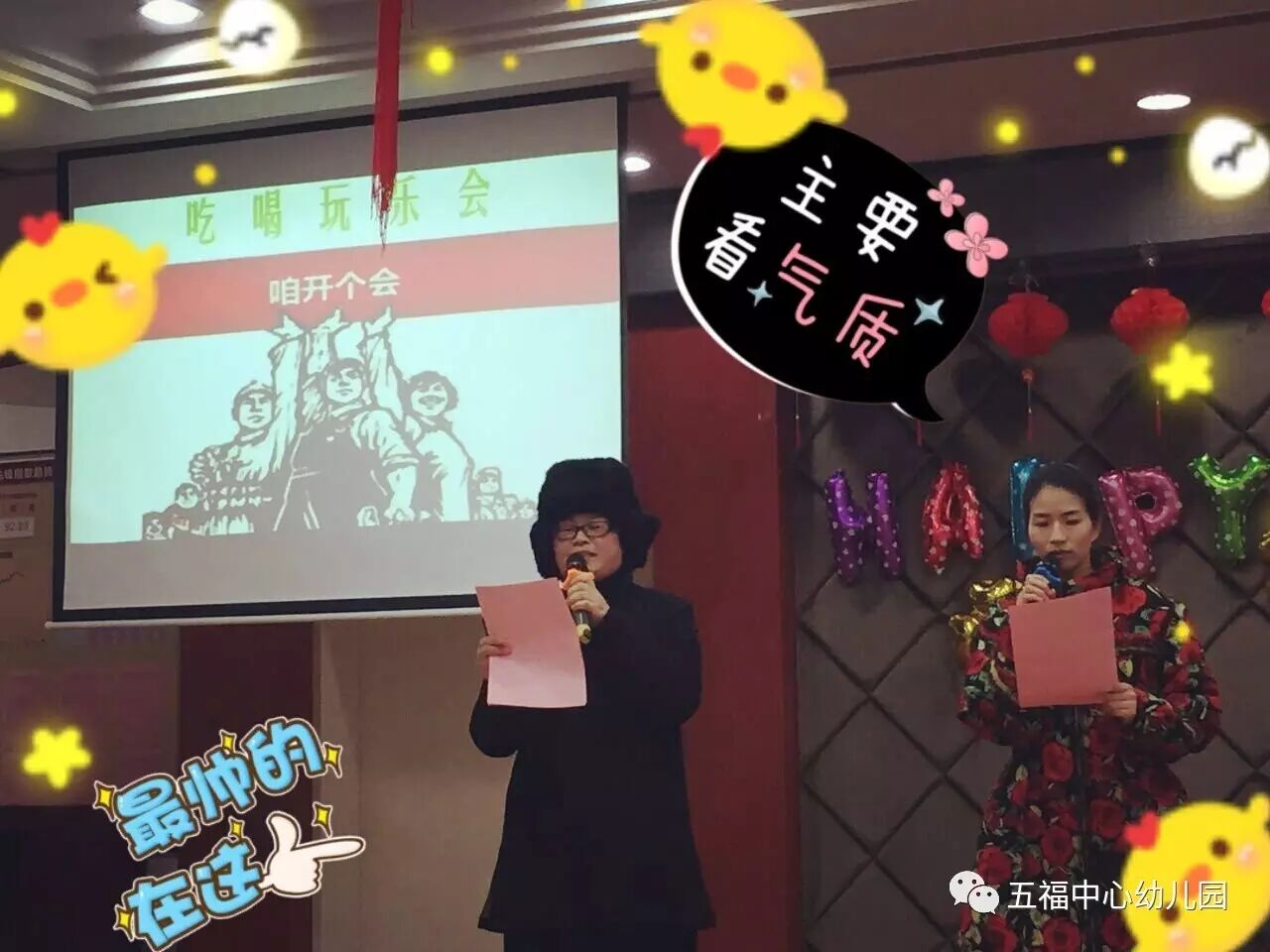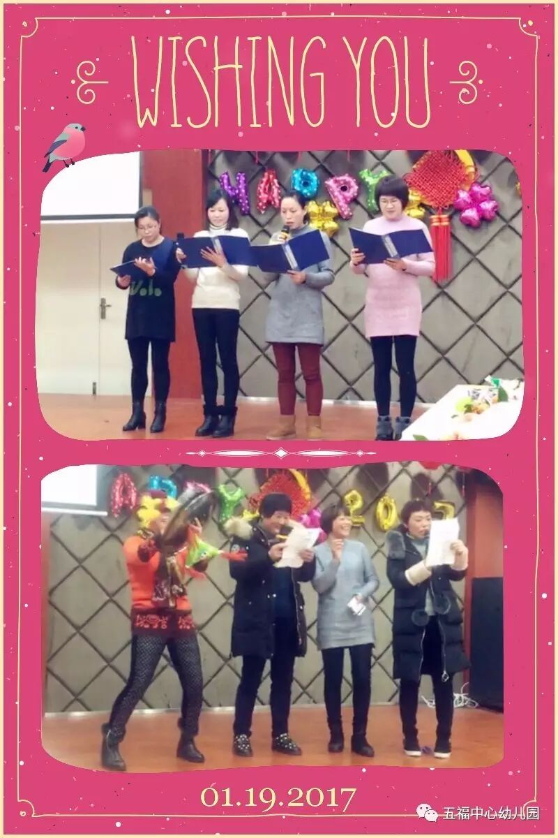 现在,我宣布:五福中心电视台2017年吃喝玩乐大会,到此结束!欢迎大家的收看!在这里,五福中心幼儿园的全体教职工们祝大家鸡年大吉,万事如意!我们明年再见!么么哒~