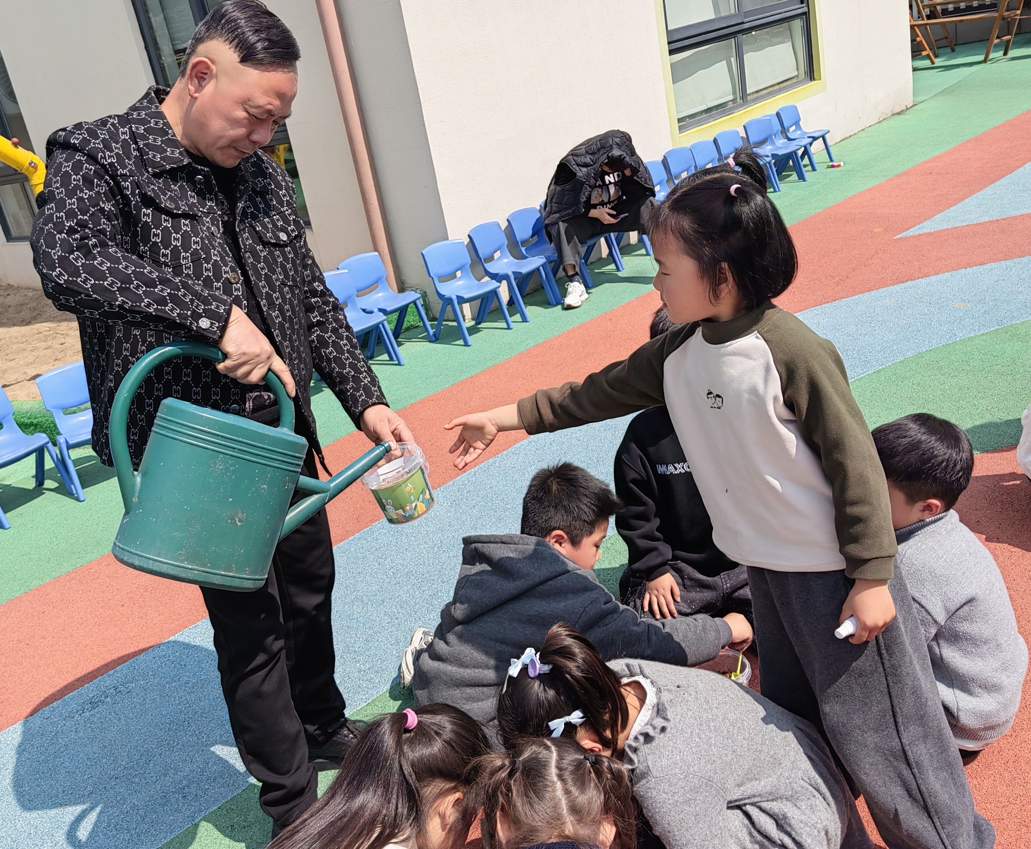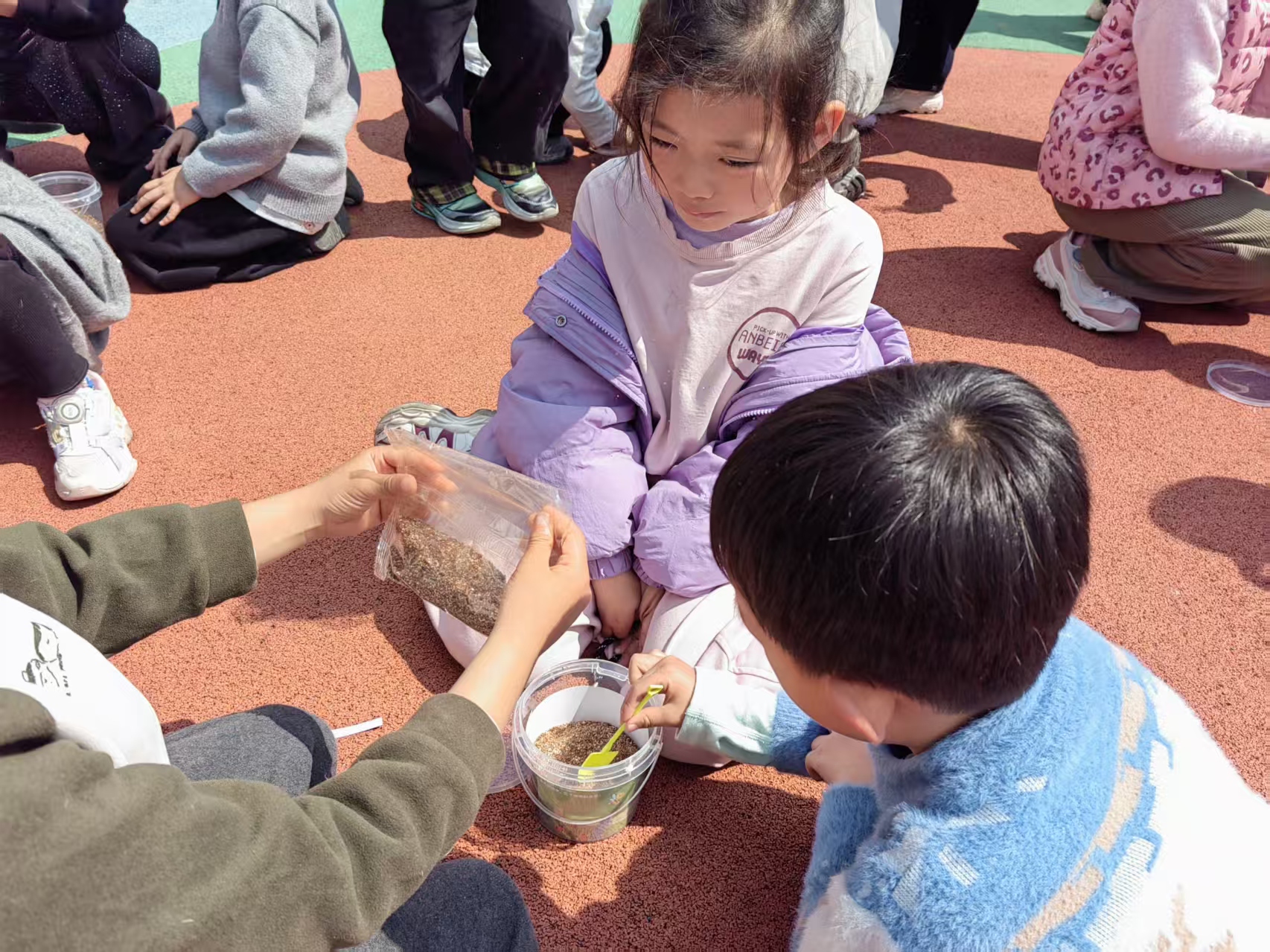春天到了,小朋友们手握种子,用铲子把泥土轻轻翻开,把种子放进泥土里,然后给它上面在铺上一层薄薄的泥土,洒点水,每天拿到太阳下面晒一晒,让它充分的吸收一下阳光,快快长大,期待着收获向日葵、黄瓜、西红柿、南瓜等等。